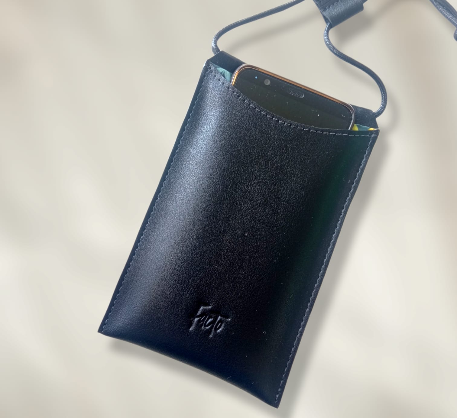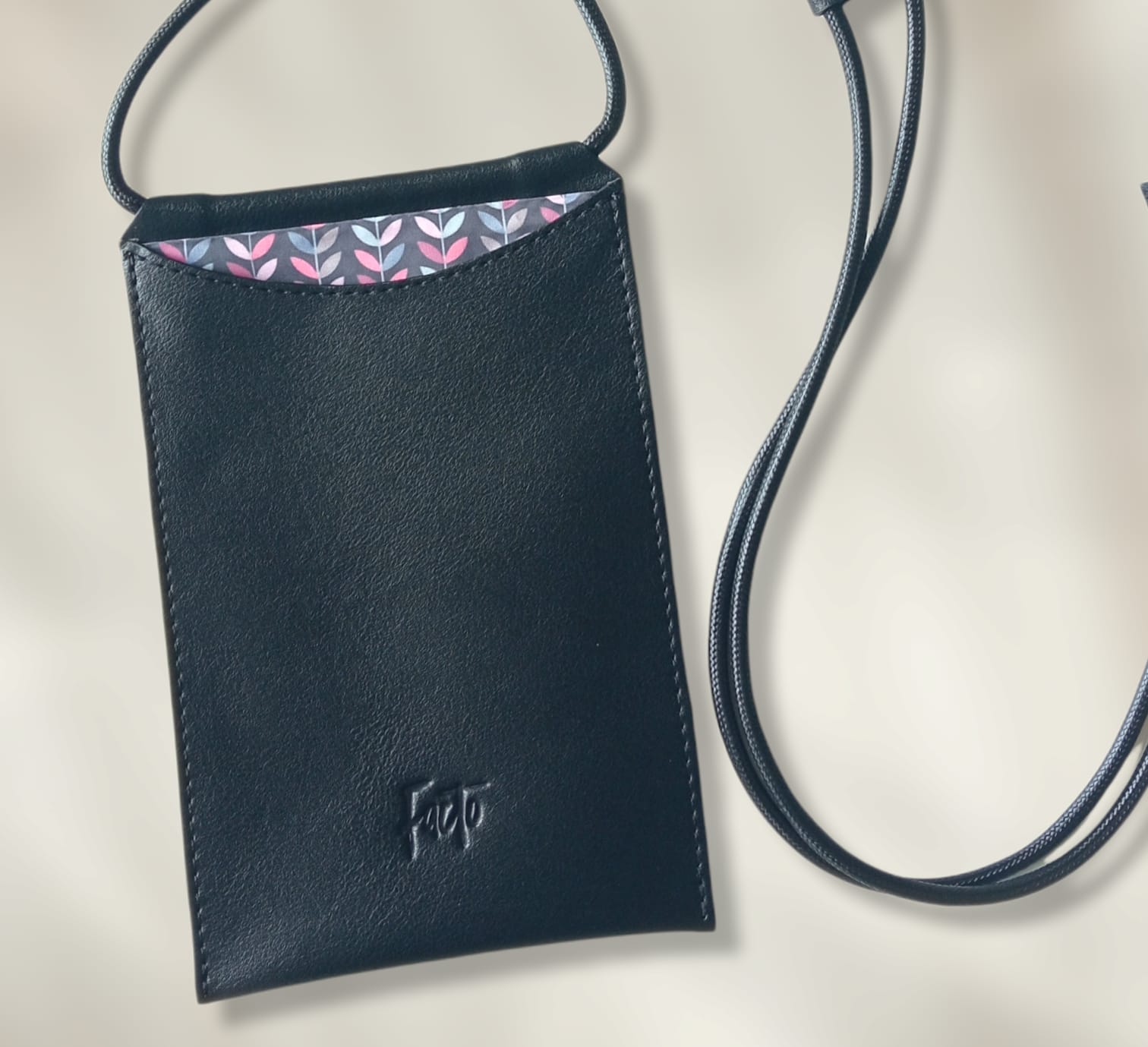 Porta celular fabricado en eco cuero, forrado internamente con seda antiflúido estampada, cuenta con 3 bolsillos posteriores para tarjetas y cordón para llevarlo colgado.