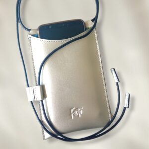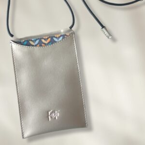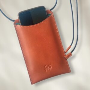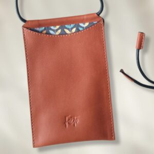 Nuestro porta celular fabricado en eco cuero italiano de altísima calidad, forrado internamente con seda antifluído estampada, cuenta con 3 bolsillos posteriores para tarjetas y cordón para llevarlo colgado.
